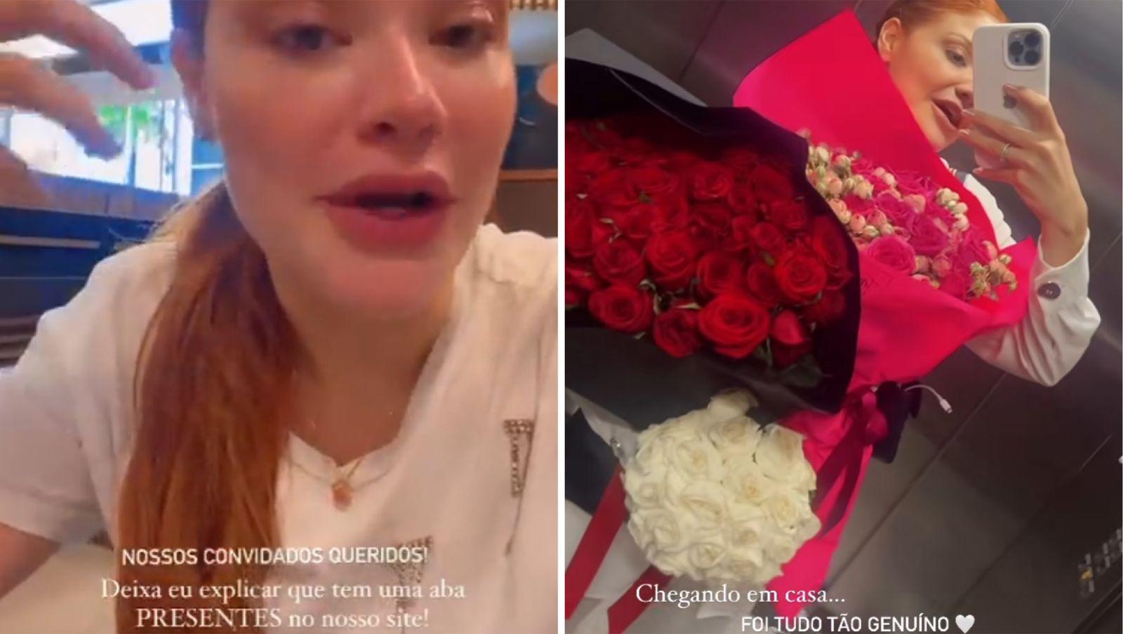 "Convidados queridos, não esqueçam dos presentes. Isso mesmo, casamento tem presente também. [...] Não está fácil aqui. Estou dando essa leve indireta porque 80% dos nossos convidados não deram presente ainda. A cerimonialista nunca viu nada parecido. Estou rindo, mas é de nervoso", comentou Fabíola nos 'Stories', antes da cerimônia.