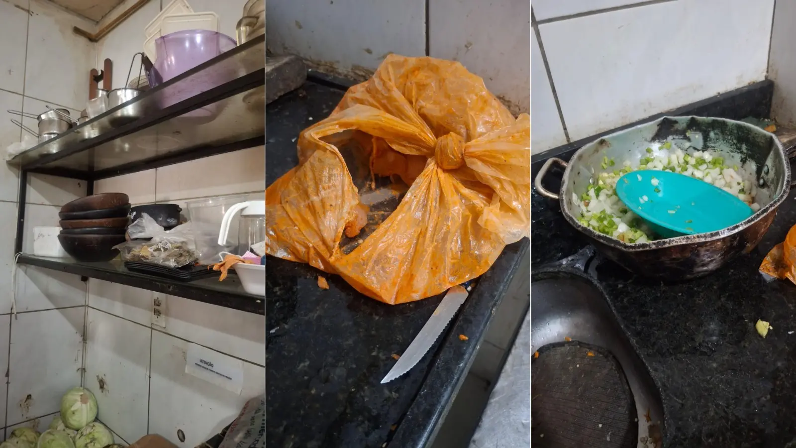 Imagens da fiscalização acessadas pelo Diário do Nordeste mostram, ainda, pratos e talheres sujos no chão, cheios de larvas, além de carnes guardadas em sacos plásticos sem identificação, vegetais soltos e equipamentos oxidados.