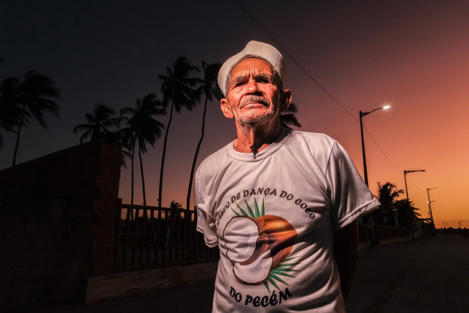 Mestre Miranda, 81, é presença certa nos encontros do grupo de Dança do Coco do Pecém, que acontecem aos domingos, numa barraca onde o Sol de fim de tarde ilumina os cerca de 25 participantes. Caixa de som, tambor, triângulo e camisas brancas são marca do grupo.