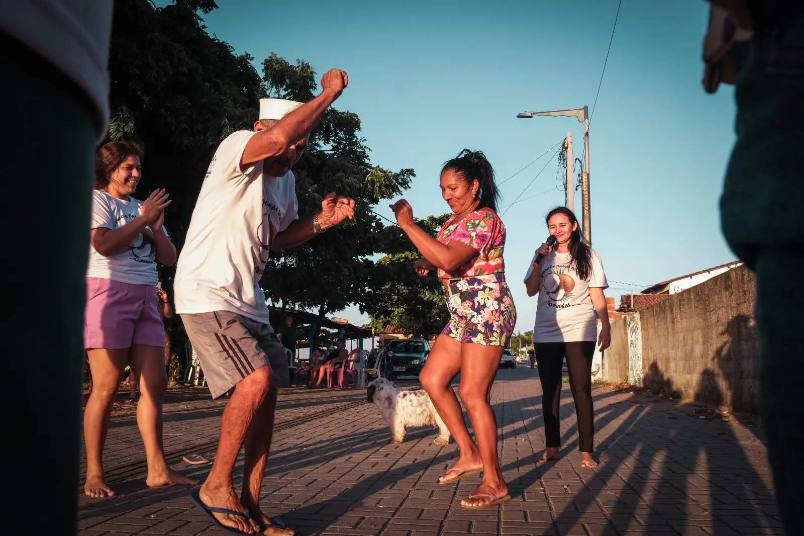 É Pedrina quem estende a mão para mim, durante a reportagem em que me mantive do lado da caixa de som, dividido entre anotar observações e bater palma, e me faz dançar junto.