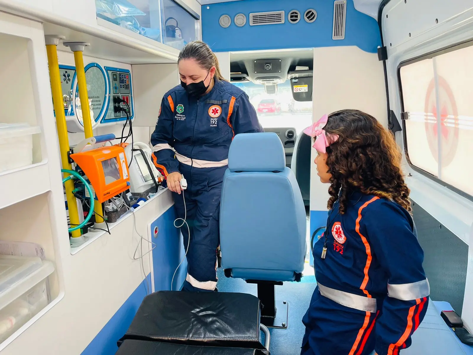 Durante a visita nesta segunda-feira, Clara viu de perto uma das ambulâncias, teve a oportunidade de entrar no interior do veículo e conhecer a estrutura. Uniformizada de “samuzeira”, ela ainda deu uma volta na viatura, encantada com o som do giroflex.