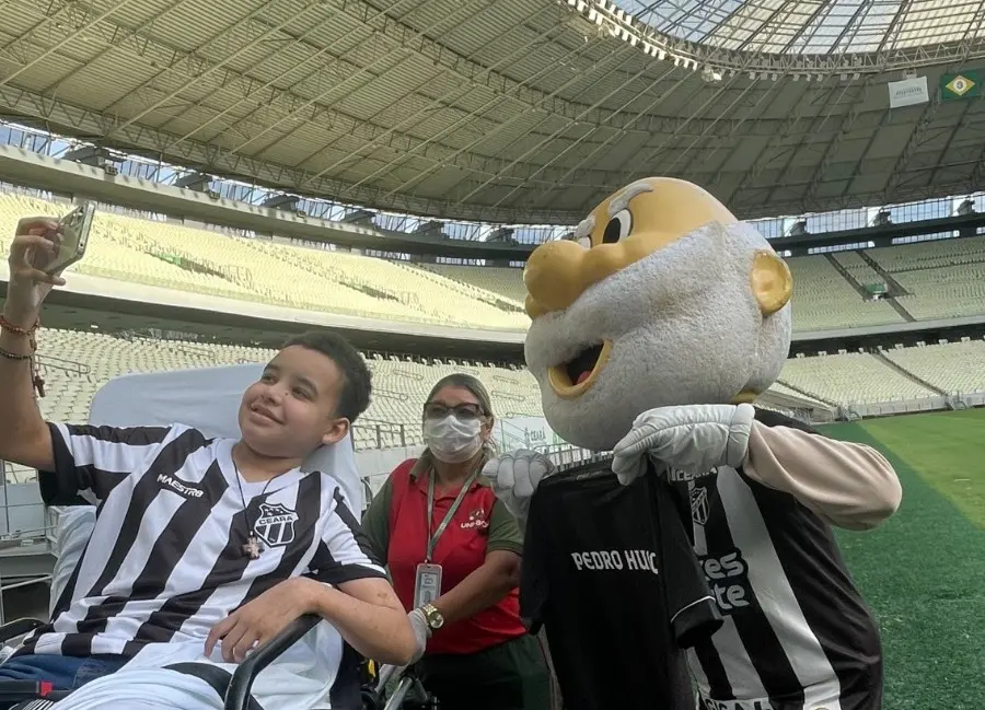 Pedro foi levado ao estádio por uma equipe multidisciplinar do Hias, que envolveu médicos especialistas, enfermeiros, assistentes sociais e psicólogos. A visita foi acompanhada, também, por uma equipe da Secretaria do Esporte do Ceará (Sesporte) e por profissionais da arena.