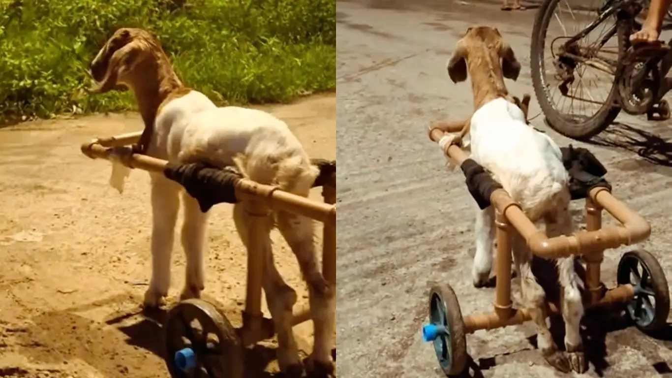 Feita com materiais reaproveitados, a estrutura funciona como um tipo de cadeira de rodas e permite que o cordeiro se locomova mais fácil, mesmo com limitações.