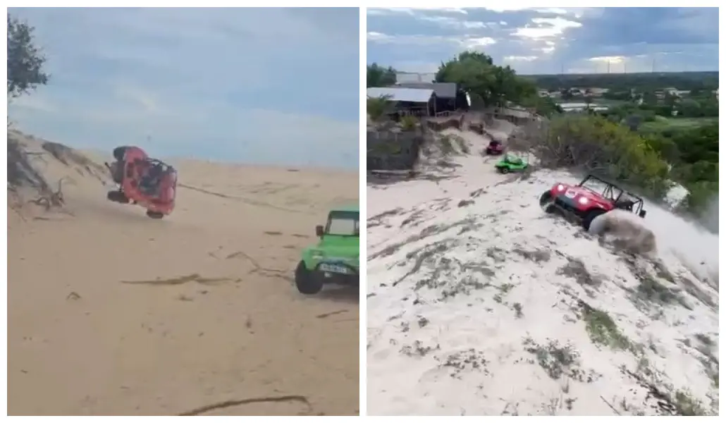 Vídeos enviados ao Diário do Nordeste mostram buggys sendo conduzidos em alta velocidade em Canoa Quebrada, no Aracati, no litoral leste do Estado. As imagens mostram condutores subindo o elevado de areia em uma duna, e um deles chega a capotar o veículo. O flagrante ocorreu no último fim de semana.