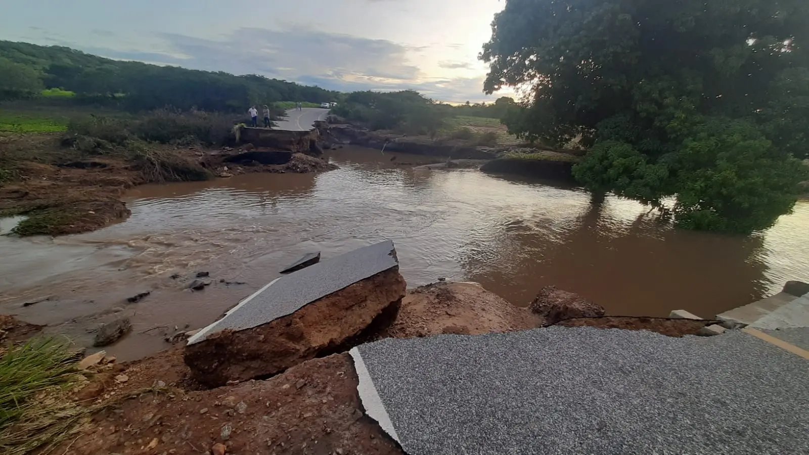 O nível da água baixou no trecho onde a rodovia foi cortada pela enxurrada e, nesta quarta-feira, é possível observar o estrago provocado pela correnteza. No local, o asfalto foi levado, deixando somente uma cratera, por onde a água continua a correr.