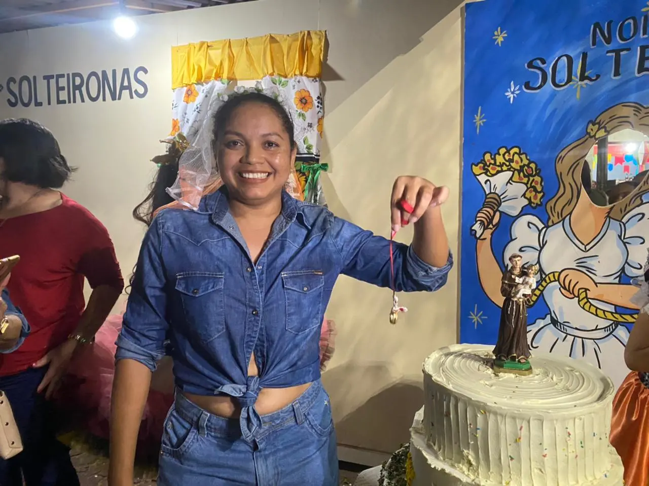 De forma aleatória, as mulheres retiram as fitas do bolo em busca da alianças. Reza a crença popular que quem "escolher a fita certa" conseguirá um marido. "Por qual razão não acreditar?", brinca. "Que ele me apresente um bom homem para próximo ano retornamos aqui em forma de agradecimento", completa Marciana.