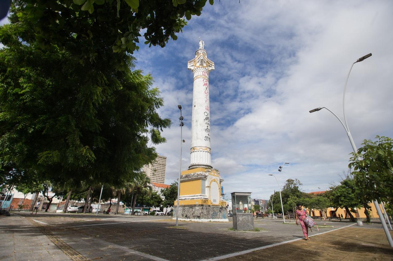 Na obra de 1991 também foram recriados jardins do início do Século XX e segundo edições do Diário do Nordeste da época, aos pés da Coluna foi estruturada a fonte e resgatada a cacimba cavada em 1824 pelo Boticário Ferreira, razão do nome da praça”.
