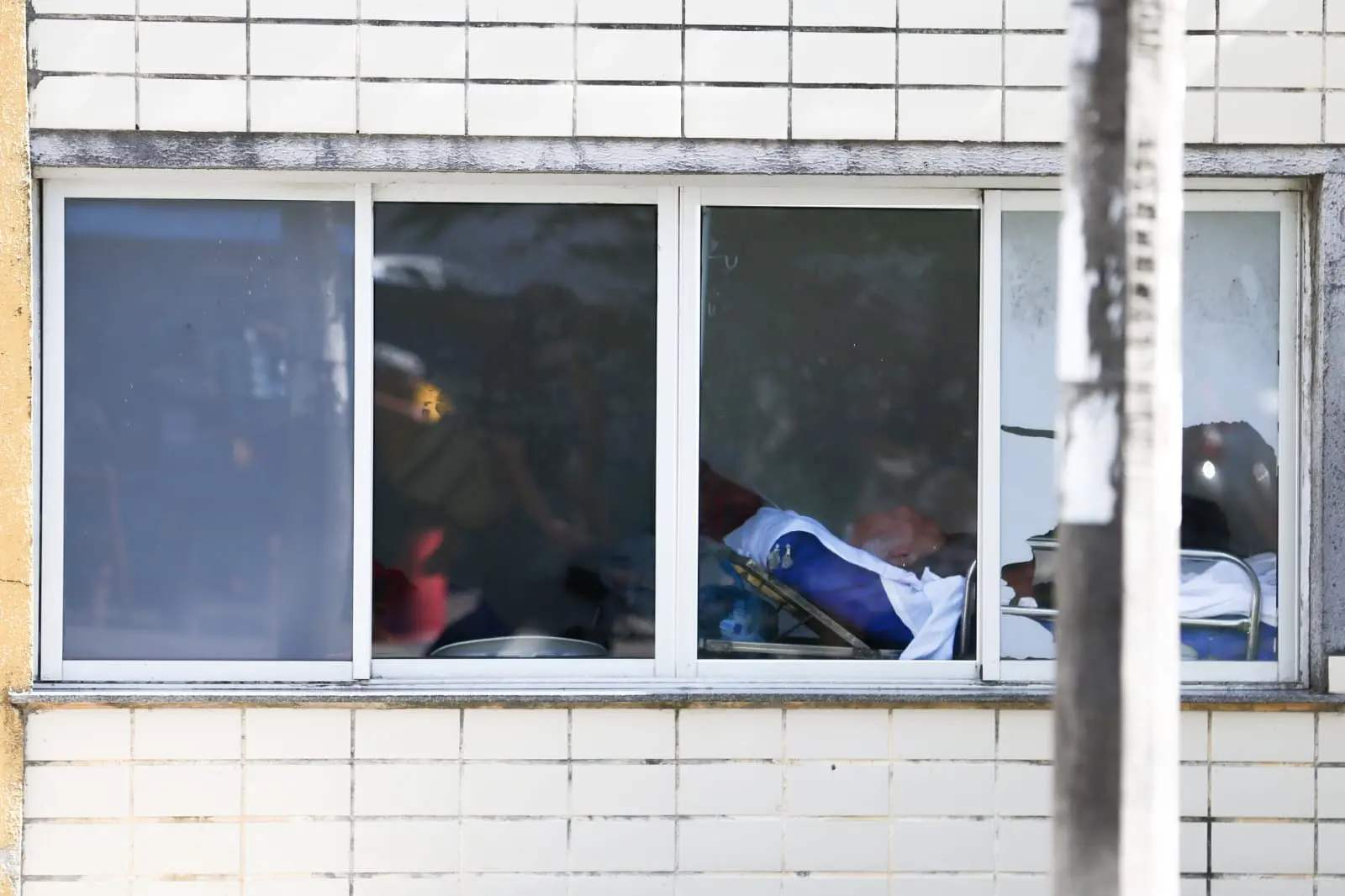 Ela relata que, após a admissão do avô, perguntou para qual leito iria. “O funcionário disse ‘vão ficar aí mesmo’. Fiz amizade e consegui uma maca estreitinha, e ele tá nela, na porta do banheiro”, descreve. Da calçada do hospital, era possível ver a maca do idoso no corredor.