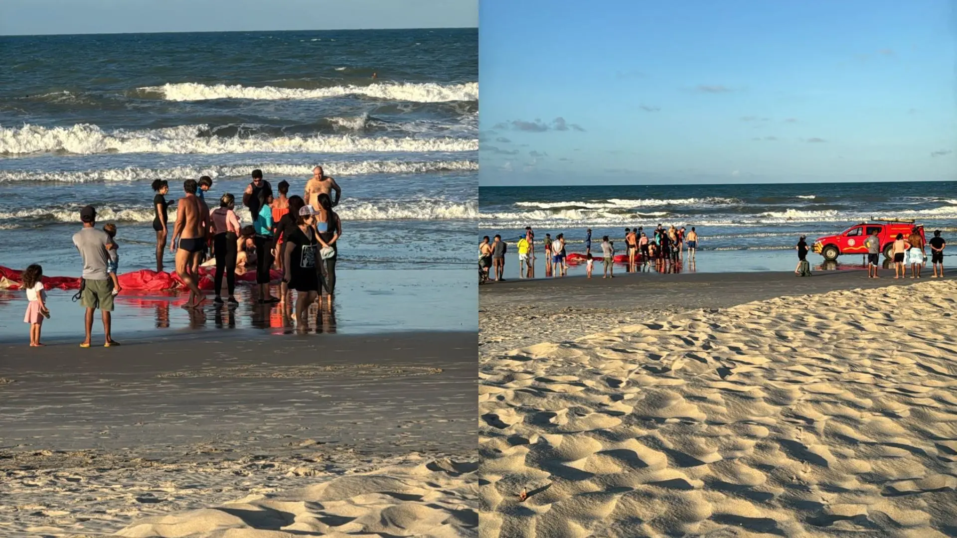 Imagens enviadas ao Diário do Nordeste mostram as vítimas recebendo o apoio de populares que estavam na praia no momento, antes da chegada dos bombeiros.