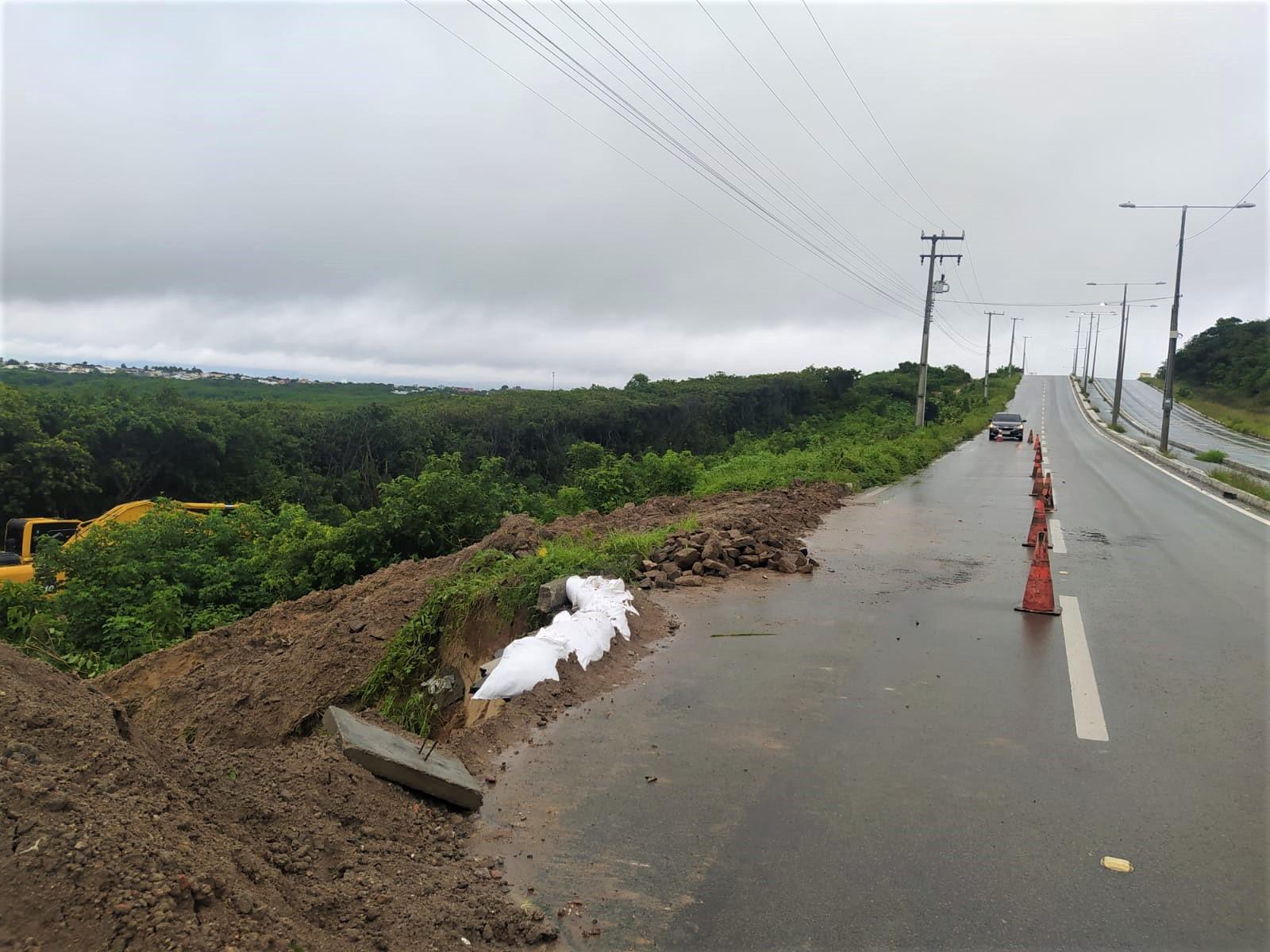 Parte do acostamento da CE-025 cedeu, provocando o bloqueio parcial da rodovia nesta segunda-feira (27), no Porto das Dunas, em Aquiraz, Região Metropolitana de Fortaleza (RMF). A área foi atingida por chuvas durante o fim de semana.