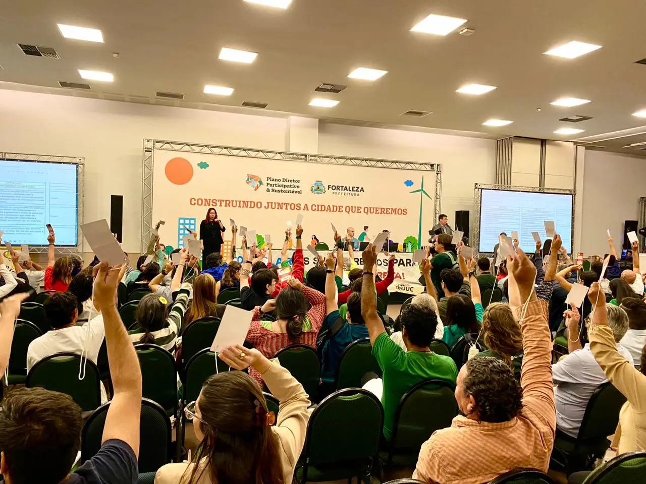 Desde a última sexta-feira (24), quase 600 pessoas delegadas estiveram reunidas no Centro de Eventos para discutir e votar as propostas para o Plano Diretor Participativo e Sustentável (PDPS) de Fortaleza. No sábado (25), os participantes foram divididos em seis Grupos de Trabalho (GTs) temáticos que analisaram os diferentes eixos do documento e apresentaram destaques sobre os artigos. No terceiro e último dia, as sugestões foram levadas para a plenária e votadas pelos presentes.