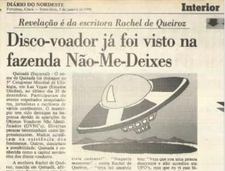 O arquivo mais antigo, de 1985, é de um jornal sobre o avistamento feito pela escritora cearense Rachel de Queiroz. No dia 13 de maio de 1960, na fazenda "Não me Deixes", em Quixadá, um objeto no formato de "disco voador" apareceu por volta das 18h30.