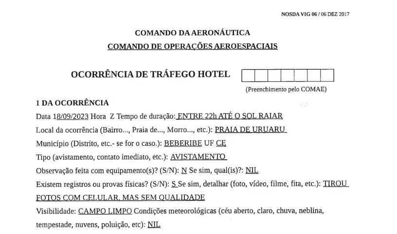 O documento indica que a aeronave estava em descida para Fortaleza, quando o objeto foi visto. "O mesmo reportou que fez manobra evasiva para evitar colisão e que o objeto estava bastante veloz, passando aproximadamente 300 pés da aeronave", completa.