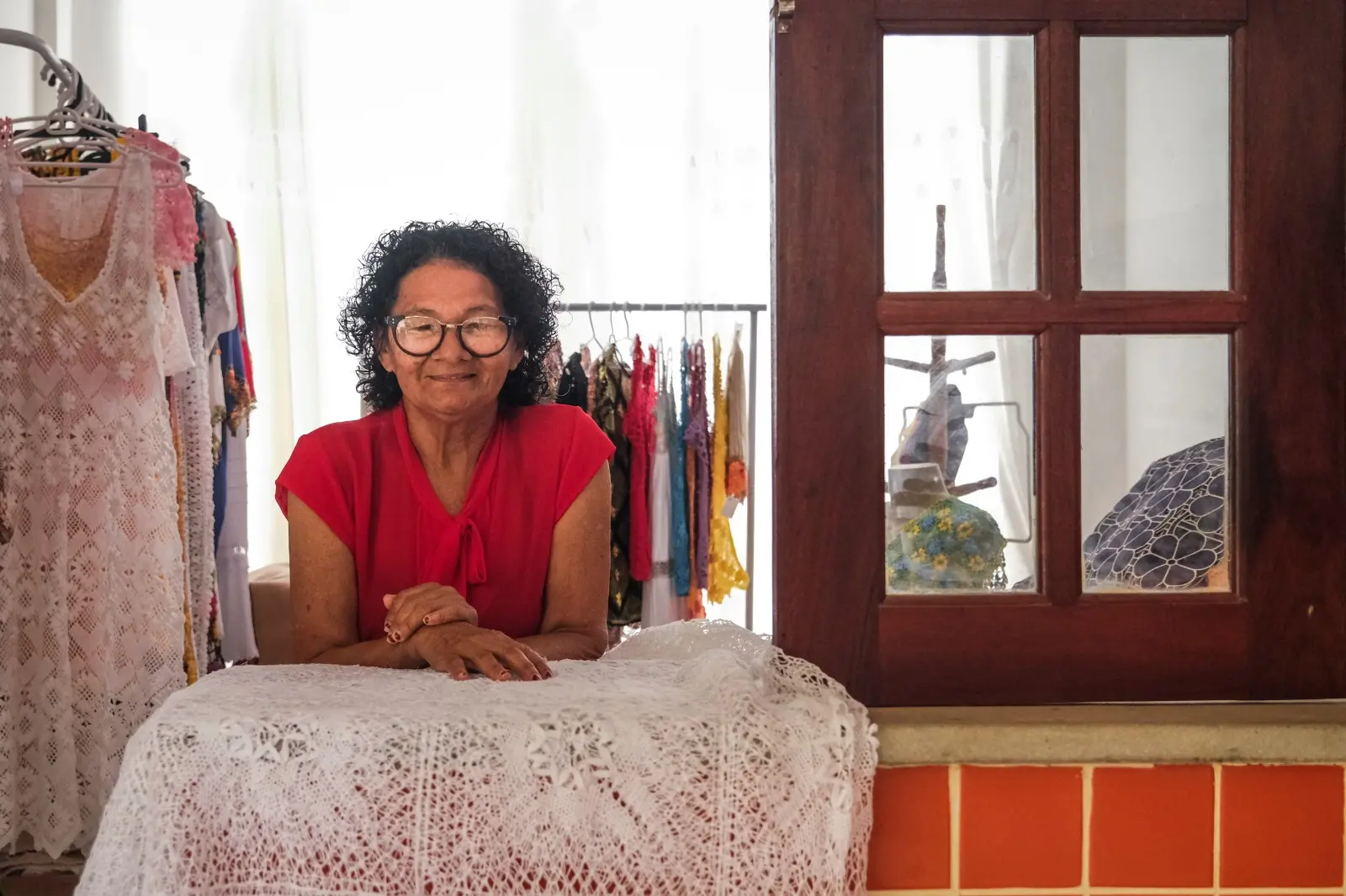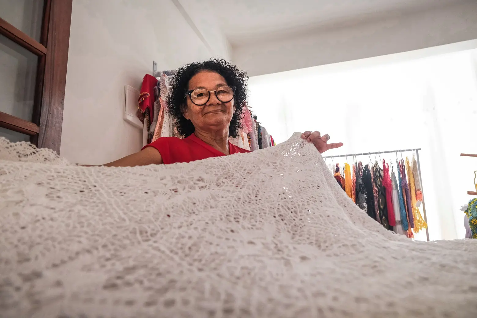 Nascida e criada na Prainha, litoral leste do Ceará, a rendeira de mão cheia “tira” qualquer peça se tiver molde. “É o que eu sei fazer”, orgulha-se. Para além de profissão, a renda também é paixão: por vezes, só encerra a jornada às 22h, imersa naquela atividade. “Se a gente tá com algum problema, trabalhando esquece”, conta.