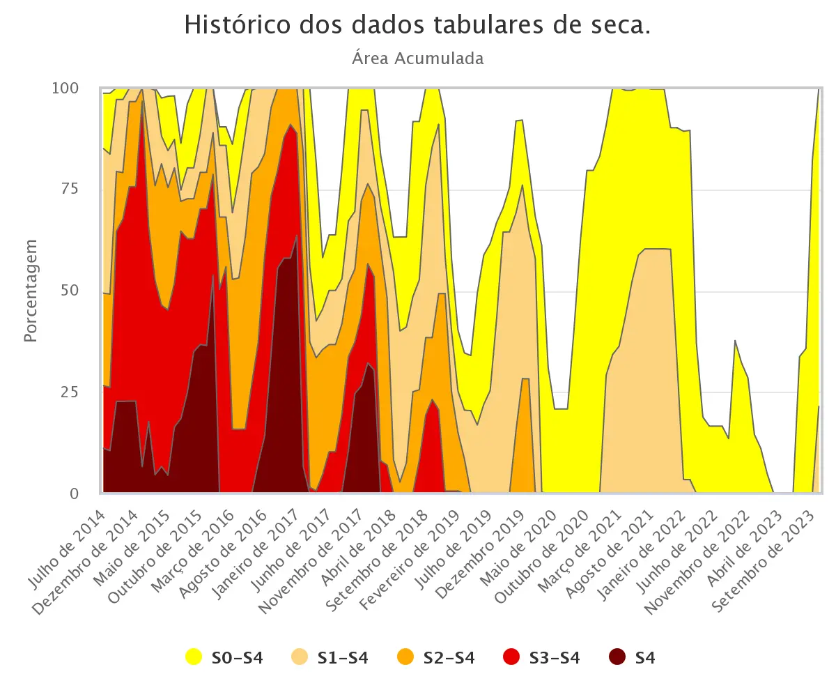 Porém, em julho, a situação se alterou mais uma vez e a seca retornou a 33,7% das áreas. Com o decorrer dos meses, houve piora. Em setembro, apenas 18% do território estava livre do fenômeno, correspondendo a áreas do litoral.