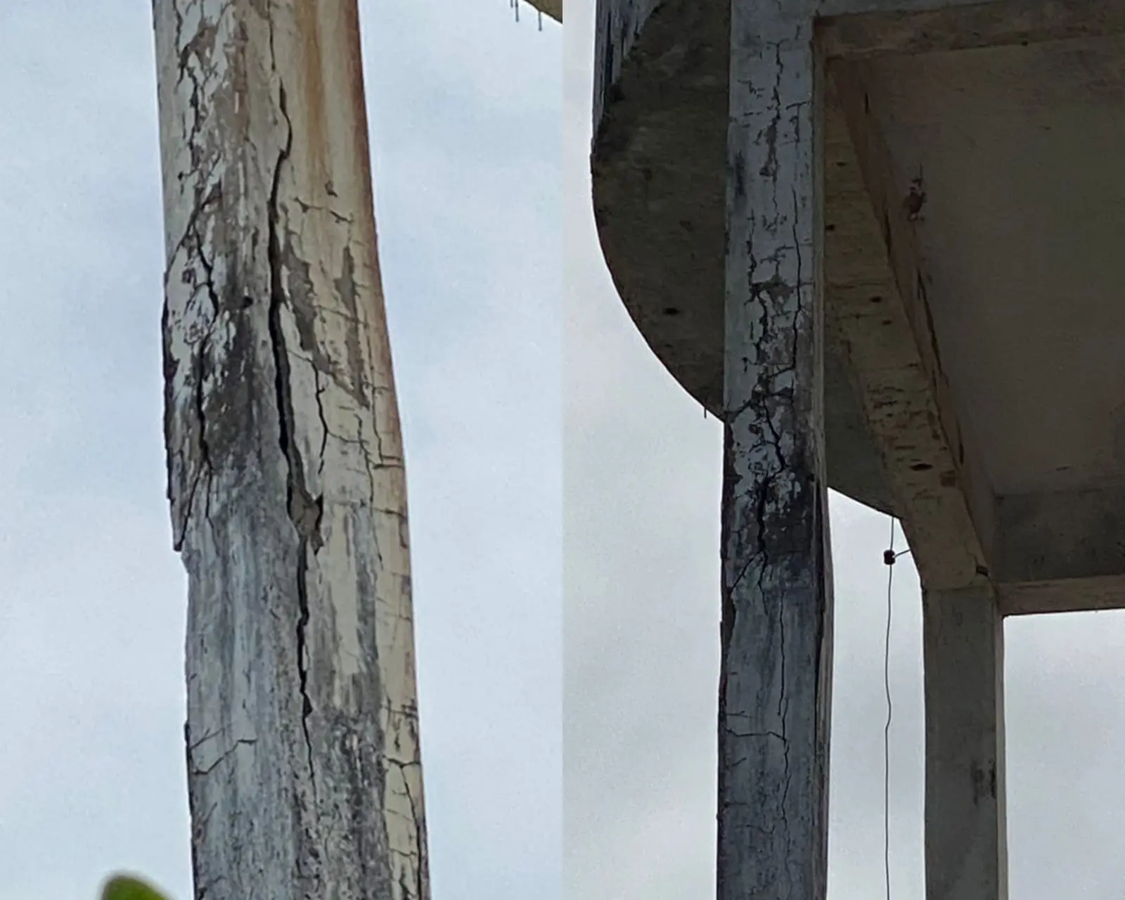 Fotografias feitas por moradores revelam a falta de manutenção no reservatório. Enormes fissuras são vistas nas pilastras e na base da caixa d'água.