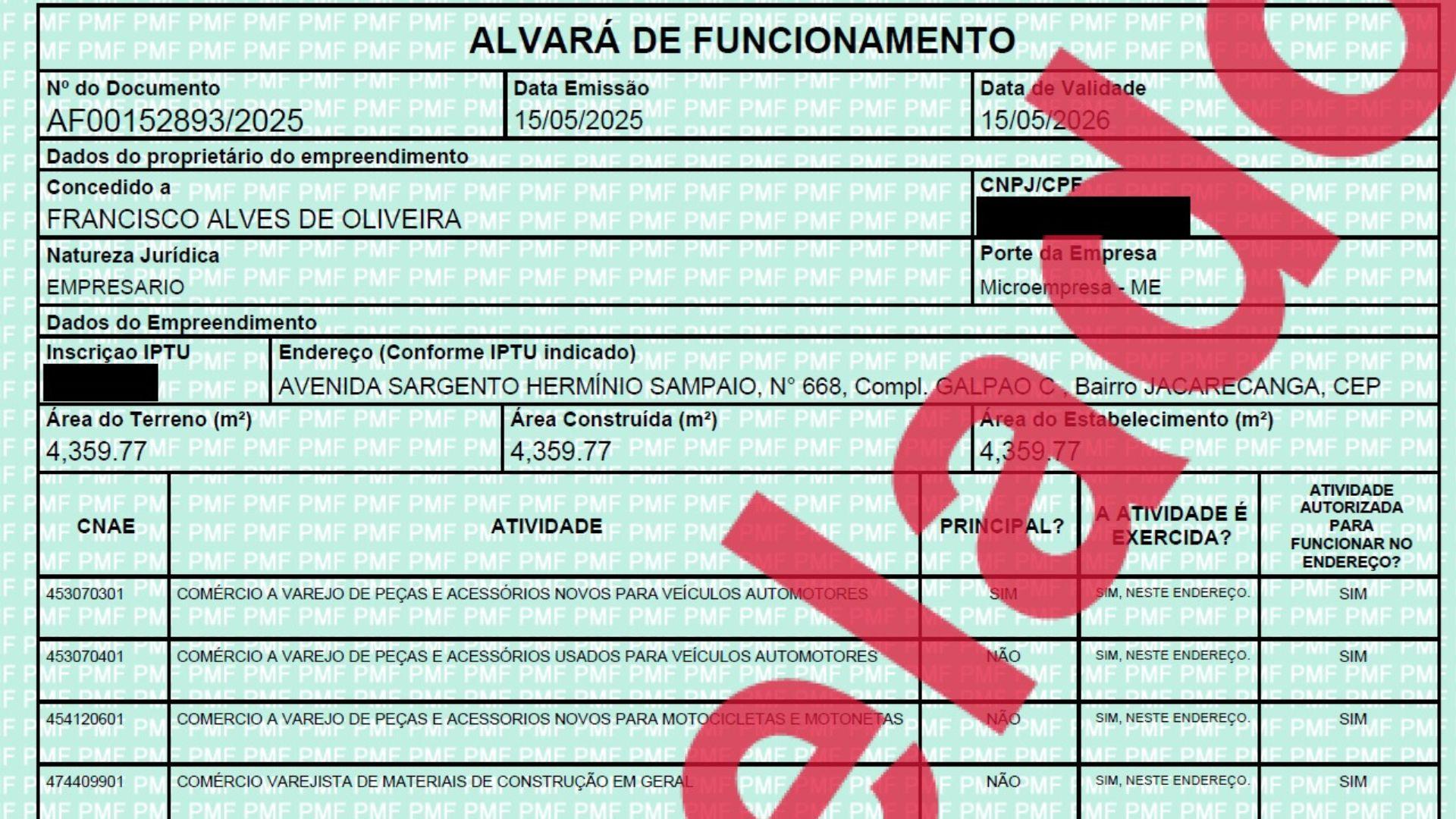 O Diário do Nordeste teve acesso ao alvará de funcionamento do estabelecimento, que classifica o empreendimento formalmente como “comércio varejista de peças e acessórios novos e usados para carros e motos; comércio varejista de materiais de construção em geral; e comércio de outros artigos usados”. No documento, consta uma tarja transversal escrita em vermelho: “cancelado”.