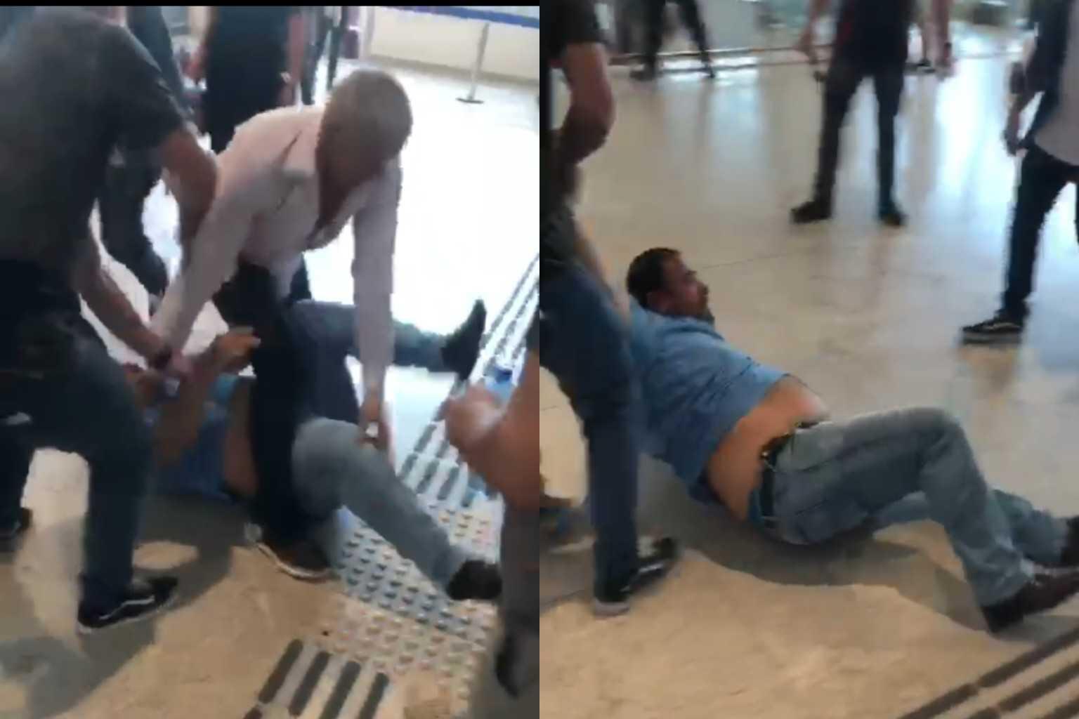 No vídeo, os homens dão socos e até caem no chão com o confronto. Em seguida, os dois são separados por pessoas que passavam no saguão.