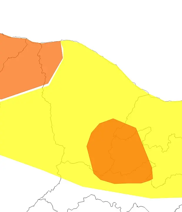 Há dois níveis de alerta. No mais forte, 62 cidades estão em "perigo". Nesses locais, há chance de corte de eletricidade, queda de árvores e alagamentos.