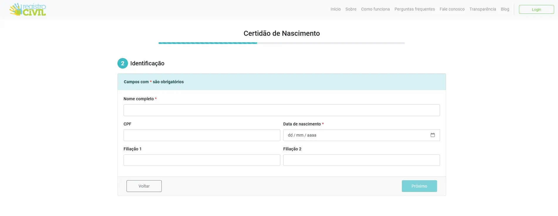 Foto: Registro Civil / Reprodução - Em seguida, forneça as informações sobre nome completo, CPF, data de nascimento e filiação;