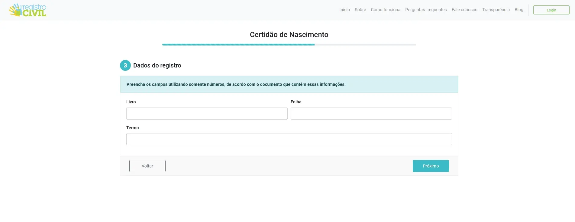 Foto: Registro Civil / Reprodução - Na página seguinte, indique os dados do registro presentes na certidão e no RG. Nesta etapa, os dados não são obrigatórios, mas mencionar número do livro (letra e número), folha ("v." quer dizer verso da folha) e número do assento (termo ou registro) agiliza o pedido, segundo o Registro Civil;