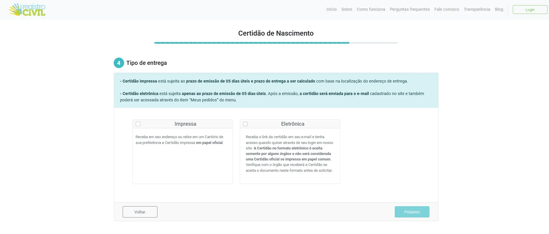 Foto: Registro Civil / Reprodução - Escolha o tipo de certidão a ser solicitado, impressa ou eletrônica: