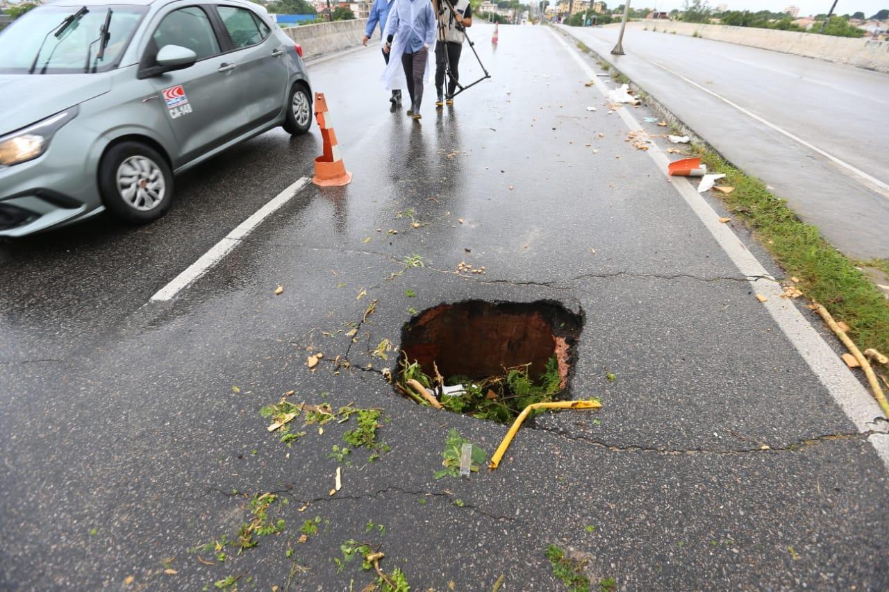 Um buraco na altura do KM 5,8 do viaduto da avenida sobre a BR-116, em Fortaleza, deixou a via totalmente interditada na manhã desta segunda. Uma "erosão em virtude das chuvas" ocasionou o problema, segundo a Polícia Rodoviária Federal (PRF).