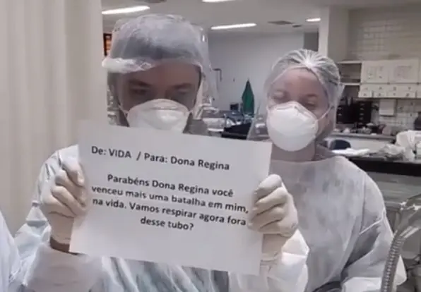 No vídeo, ao abrir um envelope, Roni traz um recado da “vida” para a paciente, identificada como Regina Pires, de 56 anos, que ficou intubada por dez dias devido à insuficiência respiratória causada pela Covid-19: “Parabéns, Dona Regina! Você venceu mais uma batalha”.
