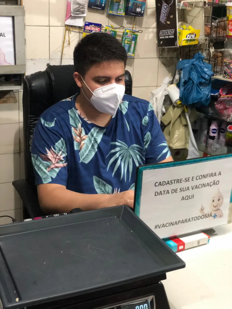 Com uma plaquinha informativa no computador sobre a bancada da Mercearia Zé Campos, no bairro Vila Velha, o comerciante Ygor de Castro, 25 anos, tem realizado o cadastro de moradores sem acesso à internet desde terça-feira (8) para garantir a vacinação do grupo contra Covid-19. Nesses dois dias, após aproximações tímidas e curiosas de pessoas da comunidade, já conseguiu efetuar 15 cadastros na plataforma Saúde Digital.