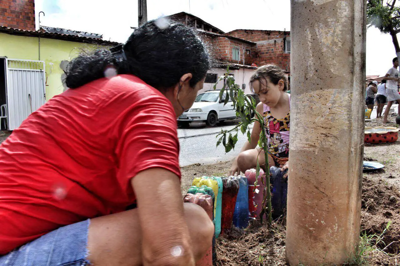 Entre blocos de concreto e asfalto, as árvores podem surgir como cor em meio ao cinza, sombra em dias quentes e refúgio do calor para os pedestres. No bairro Conjunto Palmeiras, em Fortaleza, o plantio de mudas possibilitou a revitalização do canteiro central da Avenida Valparaíso. Há três anos, moradores realizam o cuidado das árvores e plantam novas mudas em caso de necessidade, estimulando o cuidado coletivo e a preocupação de manter o local limpo, como aponta a organizadora da iniciativa, Katiana Oliveira, 38 anos.