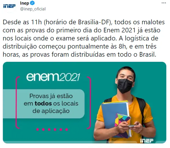 Em publicação nas redes sociais, o Instituto Nacional de Estudos e Pesquisas Educacionais Anísio Teixeira (Inep) pontuou no início desta tarde que todos os malotes com as provas do primeiro dia de exame já haviam sido distribuídas nos locais de aplicação às 11h.