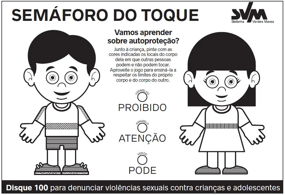 > Conheça o “Semáforo do Toque”, jogo que ensina crianças sobre autoproteção. Clique na imagem abaixo para acessar, baixar e imprimir