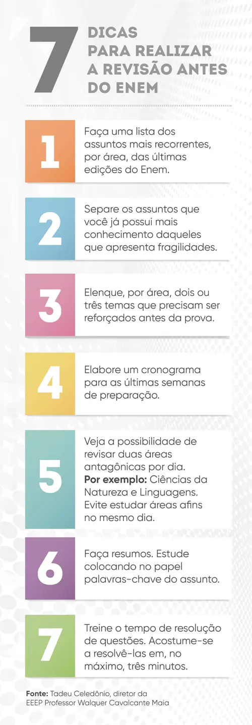 A poucos dias da realização da prova do Exame Nacional do Ensino Médio (Enem), nos dias 17 e 24 de janeiro, na modalidade presencial, e nos dias 31 de janeiro e 7 de fevereiro, na modalidade digital, chegou o momento de focar na revisão dos temas. Em entrevista ao Diário no Enem, Tadeu Celedônio, diretor da EEEP Professor Walquer Cavalcante Maia, no município de Russas, dá dicas sobre como os alunos podem se preparar.