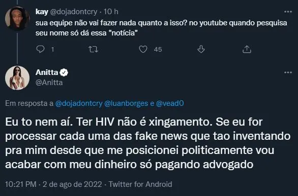 "Eu tô nem aí. Ter HIV não é xingamento. Se eu for processar cada uma das fake news que tão inventando para mim desde que me posicionei politicamente vou acabar com meu dinheiro só pagando advogado", começou a artista sobre o assunto.