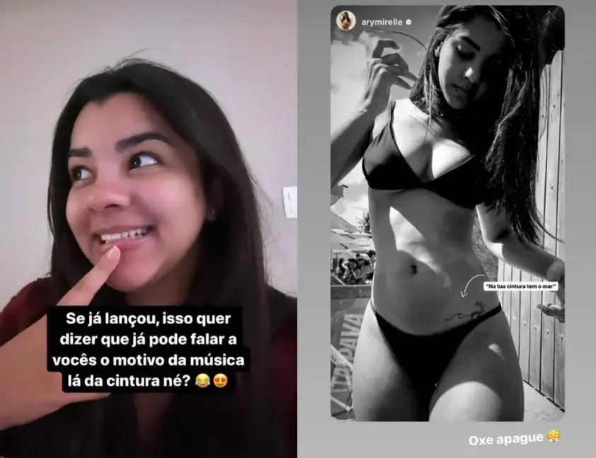 A marcação na pele de Ary Mirelle inspirou a faixa 'Na Sua Cintura', com o trecho "Na tua cintura tem o mar para eu me afundar". "Se já lançou, isso quer dizer que já pode falar a vocês o motivo da música lá da cintura, né?", questionou a moça antes de divulgar a imagem.