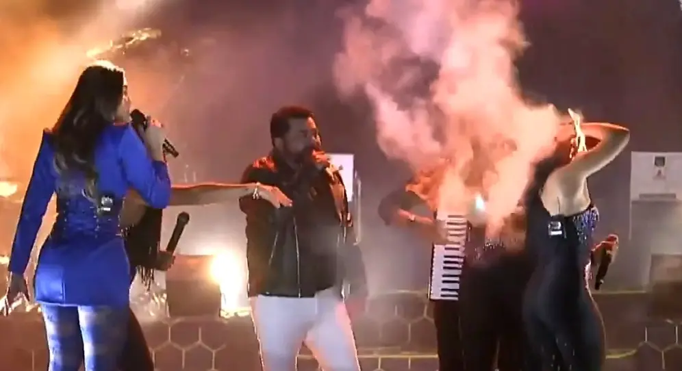 Backing vocal da Limão com Mel é atingida por rajada de fogo durante show em Pernambuco