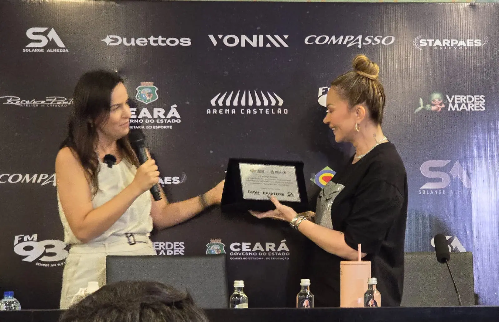 Durante encontro com jornalistas, a primeira-dama ainda agraciou Solange Almeida com uma placa em homenagem ao empenho de Sol pelo projeto Ceará Sem Fome e ainda condecorou Sol como embaixadora do projeto do governo do Estado.