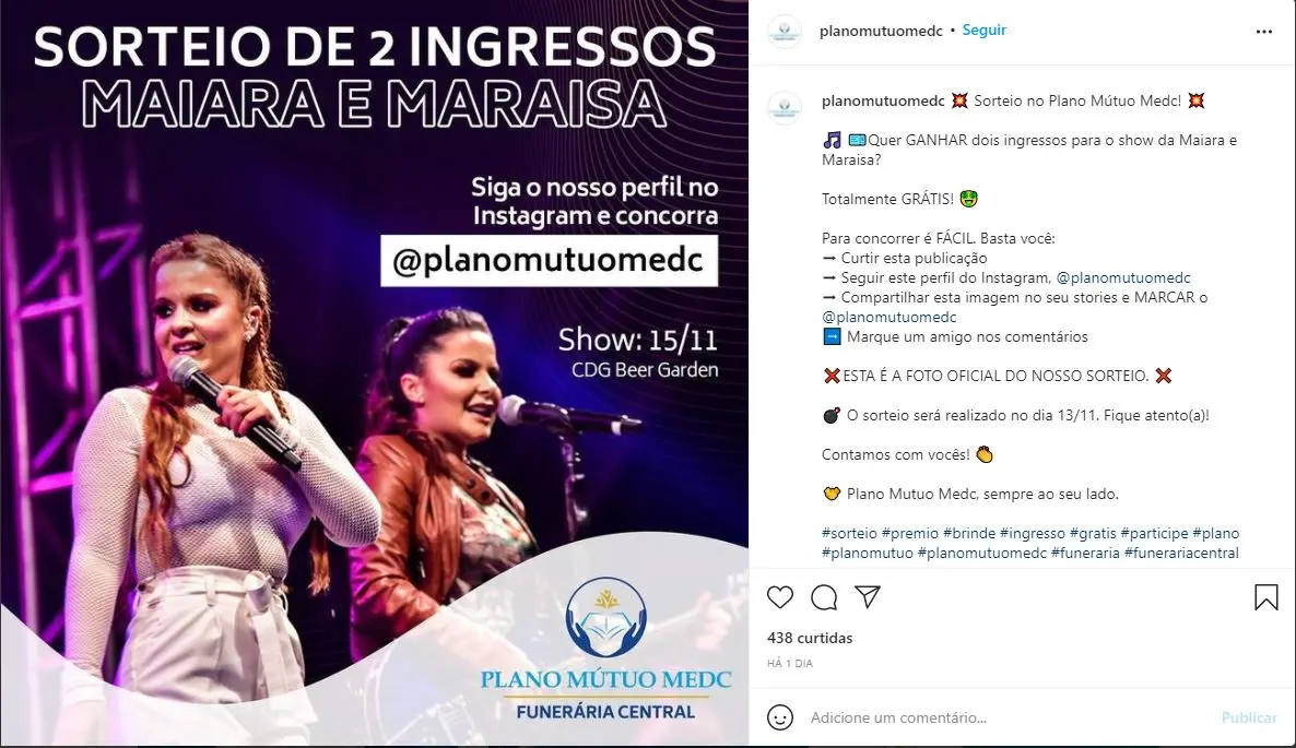 Uma funerária de Lorena, no interior de São Paulo, decidiu fazer um sorteio de ingressos para o show da dupla Maiara e Maraisa, que assumirá a apresentação que seria da amiga, previamente marcada antes do acidente de avião que vitimou a cantora e outras quatro pessoas.