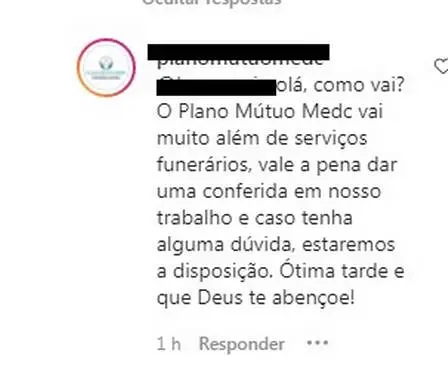 Em resposta, o plano explicou que "vai muito além de serviços funerários, vale a pena dar uma conferida em nosso trabalho e caso tenha alguma dúvida, estaremos a disposição. Ótima tarde e que Deus o abençoe".
