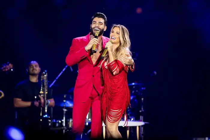 O casal chegou a se separar em 2020, mas reatou o casamento em março deste ano. De terno vermelho, sem camisa e exibindo o físico sarado, Gusttavo falou sobre o "relacionamento real" dele e Andressa.