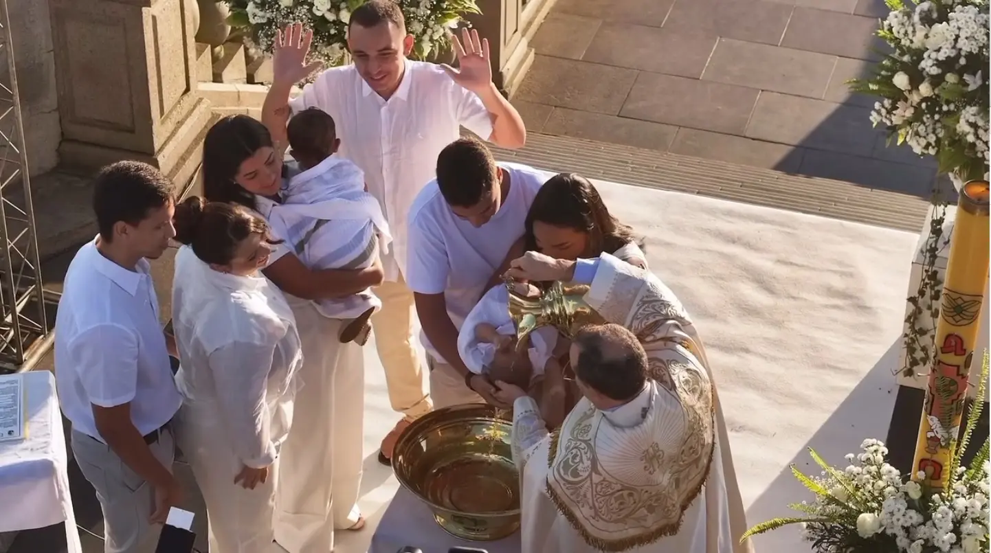 Diante do Cristo Redentor, o cantor João Gomes e a influenciadora Ary Mirelle viveram um dos momentos mais marcantes da vida em família: o batizado dos filhos Jorge, de um ano e nove meses, e Joaquim, de apenas 45 dias de vida. A cerimônia aconteceu no Santuário Cristo Redentor, nessa terça-feira (21), e foi conduzida por Dom Marcelo, sacerdote que celebrou o casamento do casal, há exato um ano.