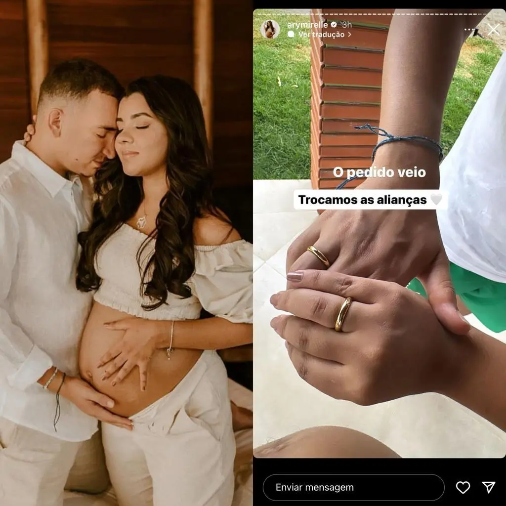 A influenciadora Ary Mirelle mostrou no Instagram, nesta terça-feira (21), que foi pedida em casamento por João Gomes. Ela postou uma foto das alianças. “O pedido veio. Trocamos as alianças”, escreveu na imagem.