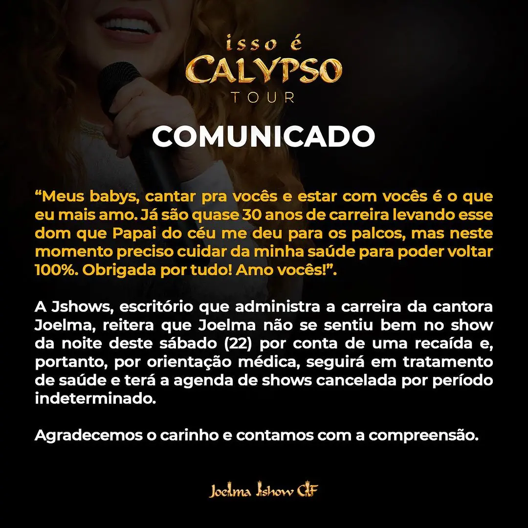 "Meus babys, cantar pra vocês e estar com vocês é o que eu mais amo. Já são quase 30 anos de carreira levando esse dom que Papai do Céu me deu para os palcos, mas neste momento preciso cuidar de minha saúde para poder voltar 100%. Obrigada por tudo! Amo vocês", escreveu Joelma em mensagem direcionada aos fãs.