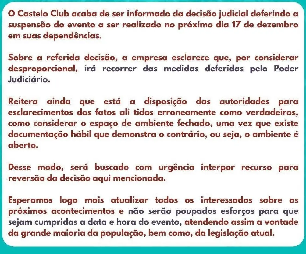 Dessa forma, em caráter liminar, a Justiça determinou que a festa seja suspensa e fixou multa diária no valor de R$ 500 mil por dia, no caso de descumprimento da determinação.