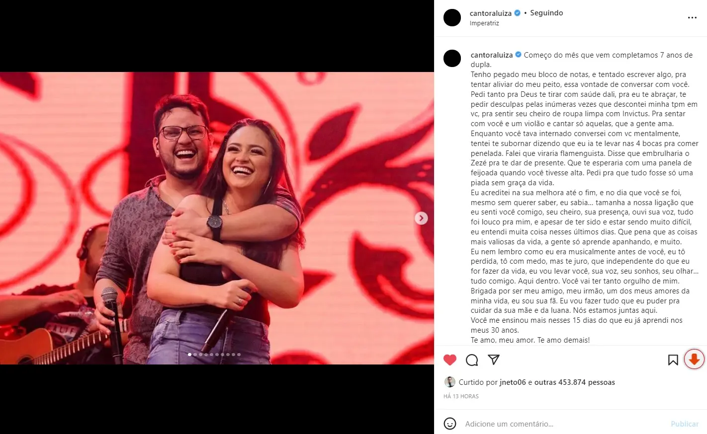 Na rede social, Luiza compartilhou uma série de fotos, contou que acreditou na melhora do amigo. O sertanejo Maurílio morreu após ter tromboembolia pulmonar, em Goiânia.