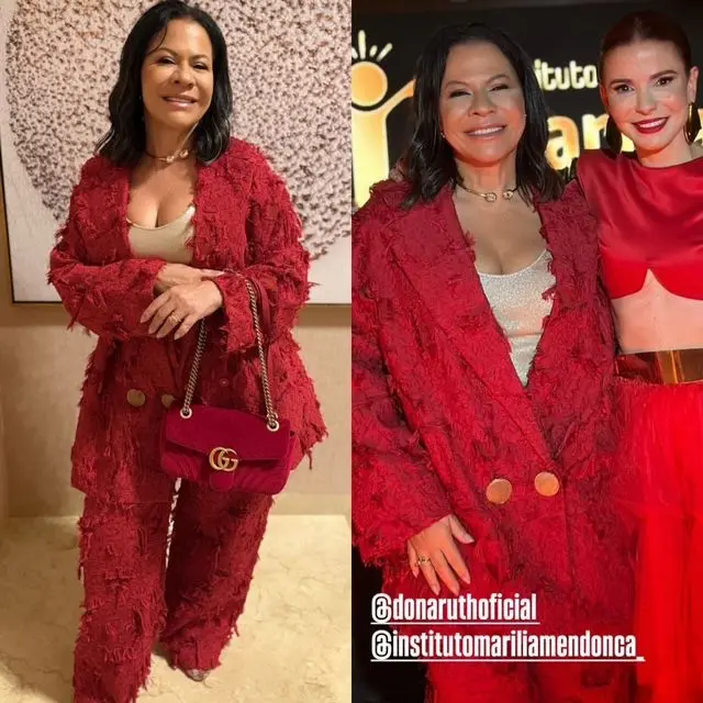 Ela mesmo publicou imagens antes de ir ao evento, e durante a festa. Dona Ruth escolheu um look elegante, na cor vermelha, para a ocasião. A festa, que celebrava a inauguração de mais uma unidade do Instituto Marília Mendonça, foi prestigiada por famosas como a cantora Fafá de Belém, que foi acompanhada da filha, a cantora e atriz Mariana Belém.