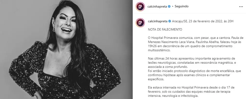 "O Hospital Primavera comunica, com pesar, que a cantora, Paula de Menezes Nascimento Leca Viana, Paulinha Abelha, faleceu hoje às 19h26 em decorrência de um quadro de comprometimento multissistêmico", informou o perfil do grupo Calcinha Preta no Instagram.
