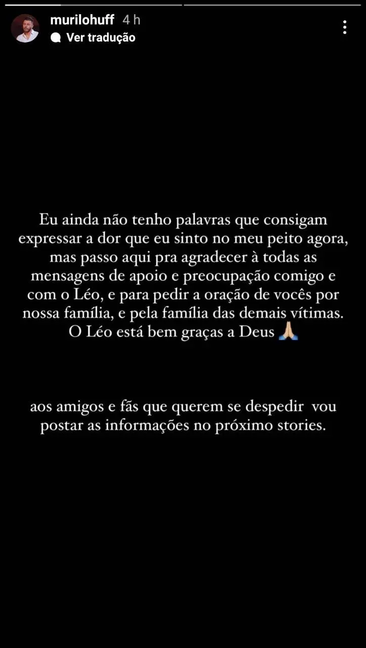 Em publicação na manhã deste sábado (6), Murilo fala da tristeza com o ocorrido e agradece o apoio que vem recebendo. Huff é pai do filho de Marília e acompanha o velório da cantora, nesta tarde, em Goiânia.
