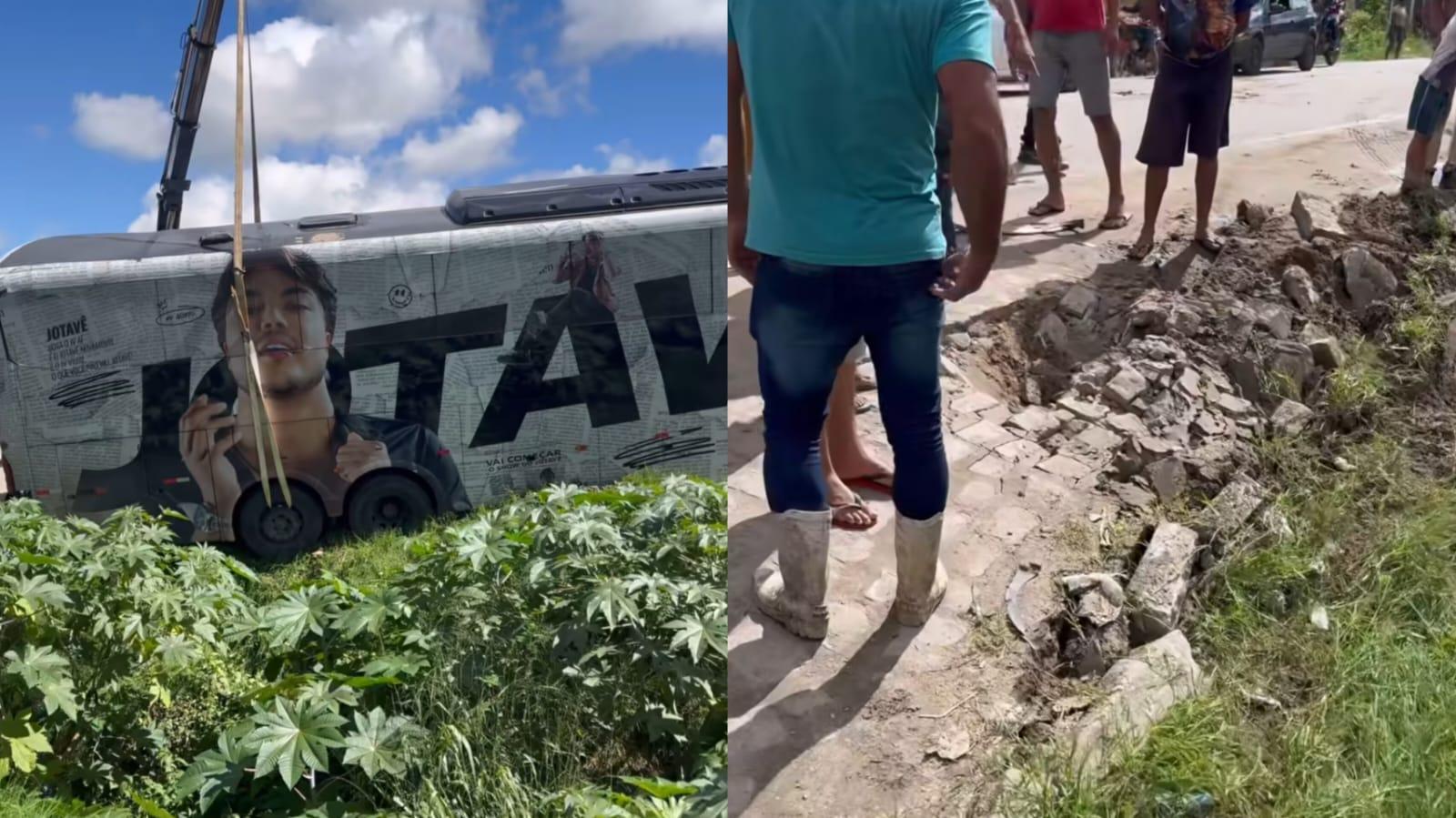 O cantor piauiense Jotave passou por um susto no ônibus que levava ele e a banda de Canhotinho (PE) para Cupira (PE), na tarde desta quinta-feira (26). Durante o trajeto, o veículo acabou ficando pendurado em uma vala.