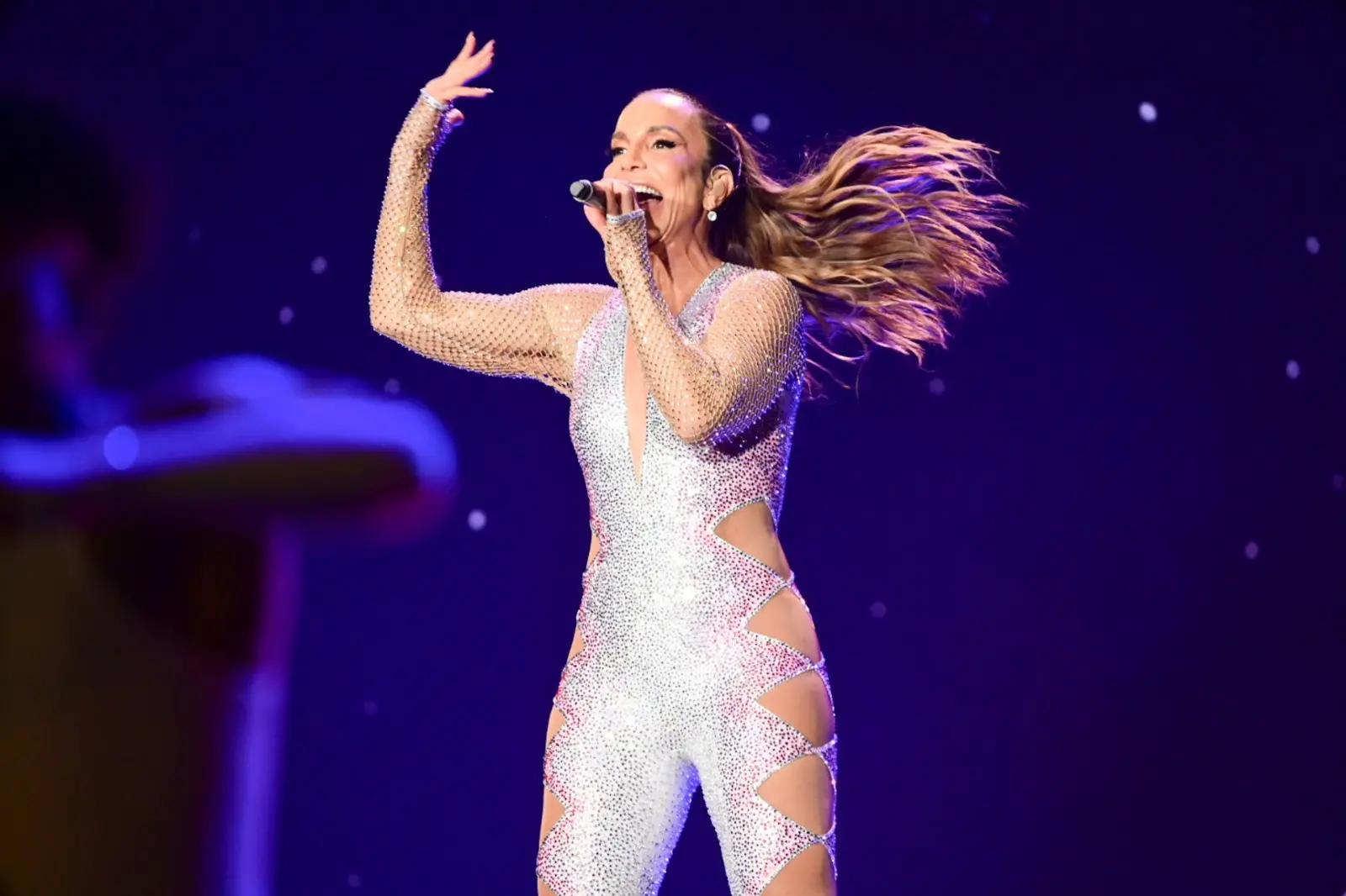 Com banda e corpo de bailarinos, a artista pediu para que os efeitos de fumaça — que estavam intensos — fossem interrompidos, já que ela praticamente desapareceu no meio deles.